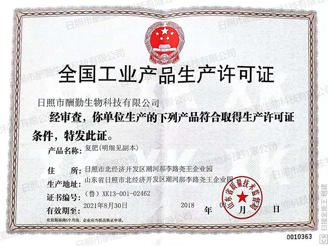 日照市酬勤生物科技有限公司生產(chǎn)許可證副本