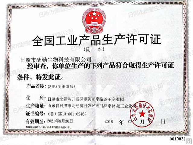 日照市酬勤生物科技有限公司生產(chǎn)許可證正本